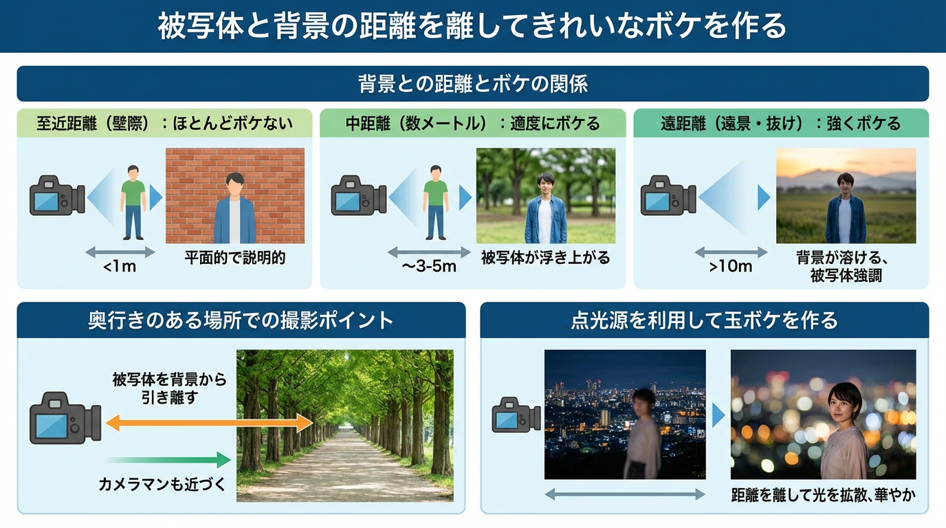 背景をぼかして被写体を際立たせるためには、被写体の後ろに数メートル以上の空間が広がる場所を選ぶ必要があります。背景との距離によるボケ味の違いと、与える印象の変化を以下の表に整理しました。