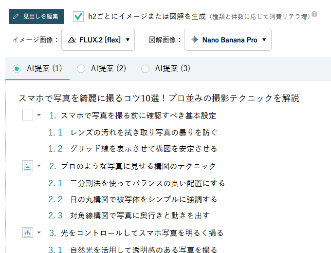 ※フリープランでは、最初の記事のみ、廉価版モデルで生成されます。 - 見出しごとに画像または図解を生成するにはプロプラン以上が必要です。