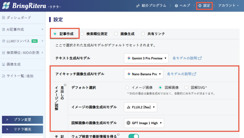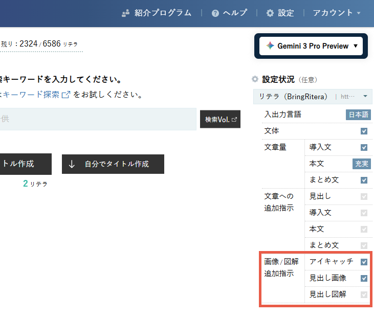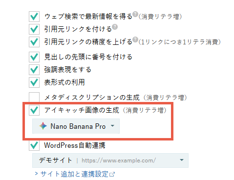 アイキャッチ画像は、見出し下部のメニューで付与するかどうかと、AIモデルの指定ができます。