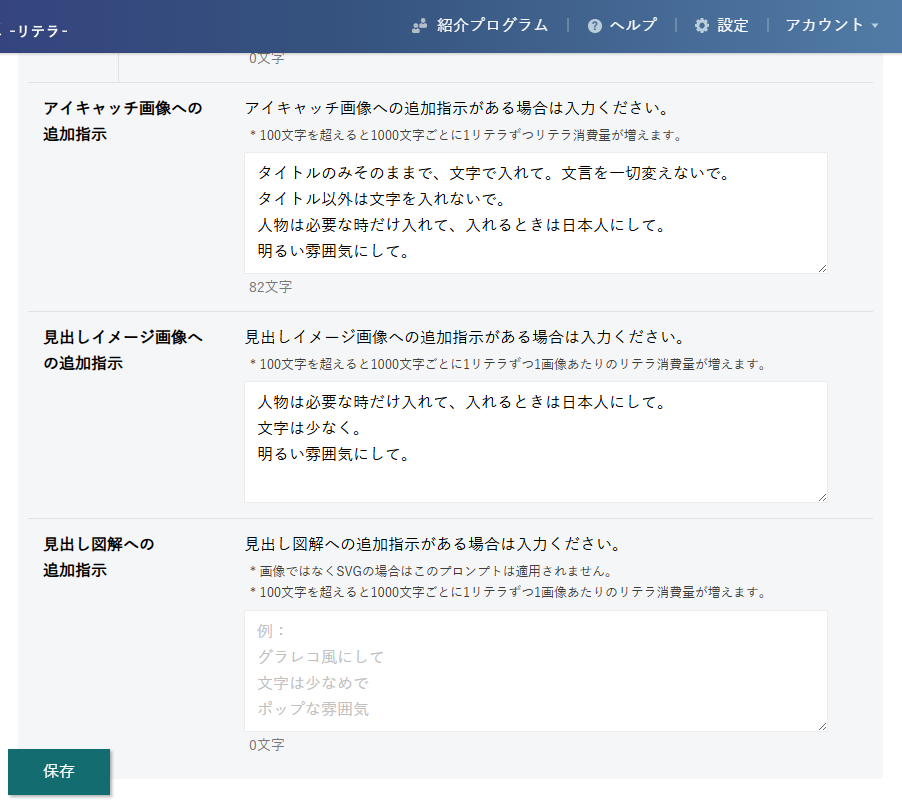 | 見出しイメージ画像 | 指定したAIモデルの消費リテラ数×作成枚数 |