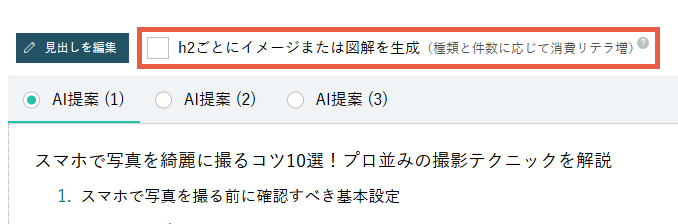 h2の見出しごとに画像または図解を作成するには、記事作成画面の見出し部分で、「h2ごとにイメージまたは図解を作成」のチェックボックスにチェックを入れてください。