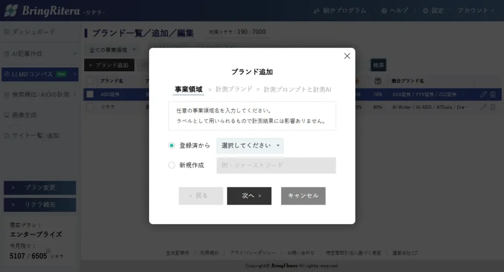 次に進むと、自ブランドと競合ブランドを登録するステップとなります。言及有無の計測は、指定した文字列が生成AIの出力に含まれるかどうかで判定します。1回でも言及されればその計測分は「言及あり」という結果となり、その回の生成AIの出力に複数個所言及があっても結果は変わりません。