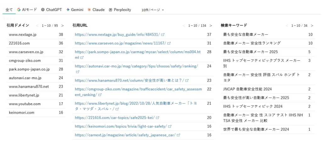 次の結果は「最も安全性が高い自動車メーカーはどこ?」というプロンプトで生成AIが参照したドメイン/URLと検索に用いたキーワードの頻度順です。