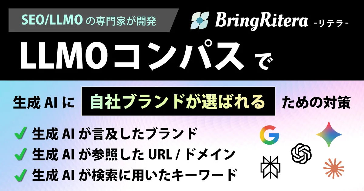 リテラ(BringRitera)の「LLMOコンパス」は、Google検索のAIモードなど生成AIが自社と競合のブランドにどの程度言及しているかと、参照したURL/ドメイン、検索に用いた検索キーワードを可視化できます。その詳細と使い方についてご紹介します。