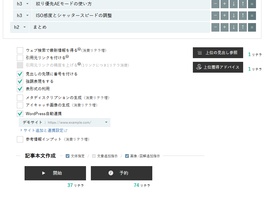 AIライティングは、見出し生成、タイトル生成、本文生成の各タイミングで、選択したAIモデルやオプションに応じたリテラポイントが消費します。