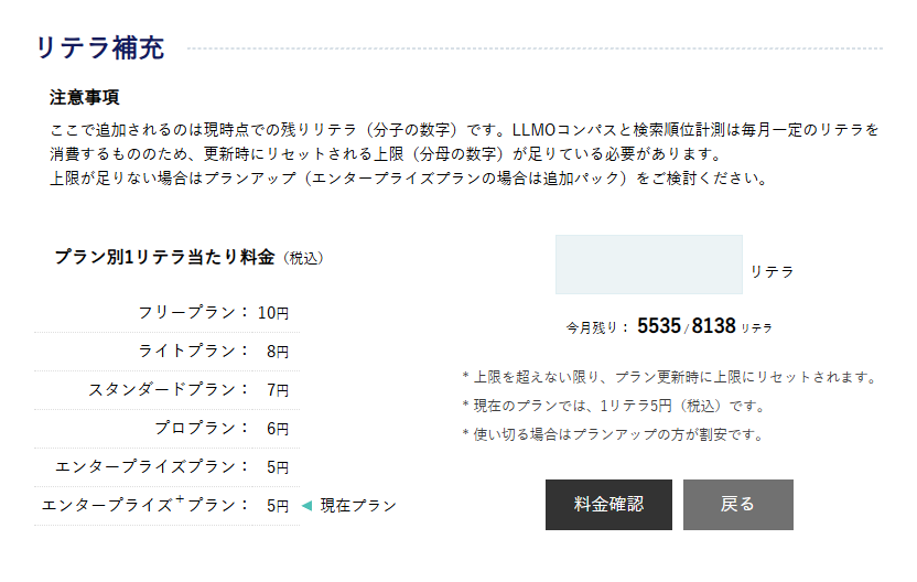 ここで追加されるのはその時点での残りリテラ(分子の数字)です。LLMOコンパスと検索順位計測は毎月一定のリテラを消費するもののため、更新時にリセットされる上限(分母の数字)が足りている必要があります。