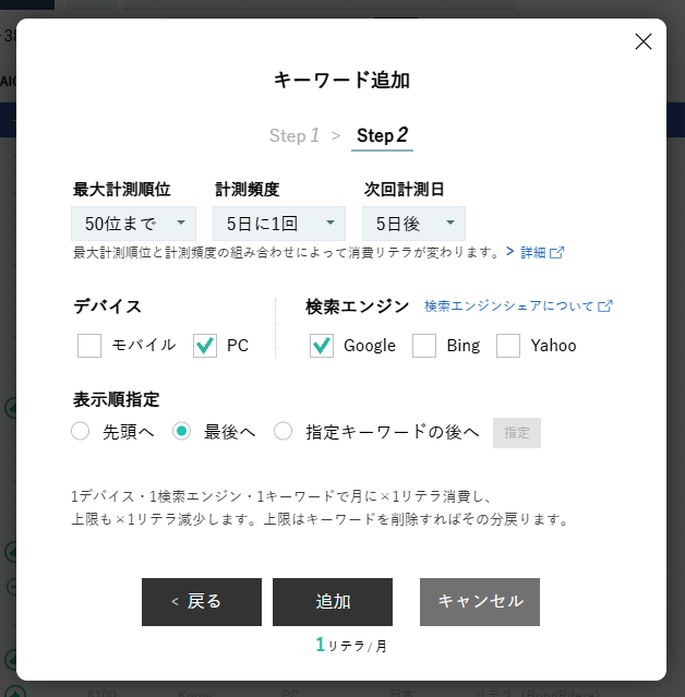 例えば、1キーワードを50位まで、5日に1回、PC・Googleという条件で計測する場合は1リテラを消費します。