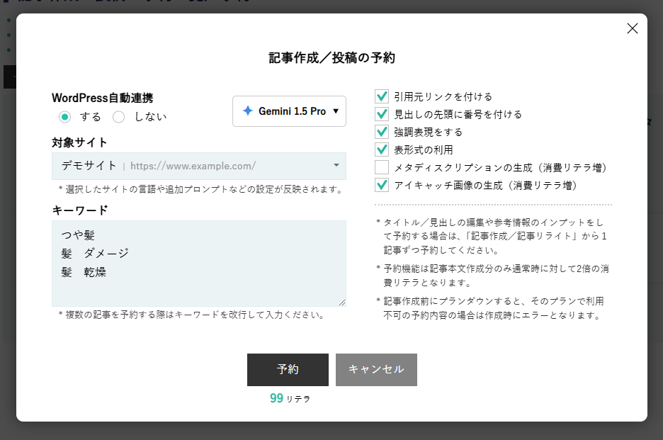 例えば9記事予約した場合、プロプランなら9日先まで予約が埋まり、エンタープライズプランだと3日目で記事作成が完了する予定となります。 - 消費リテラは、記事本文作成分のみ通常時の2倍となります。